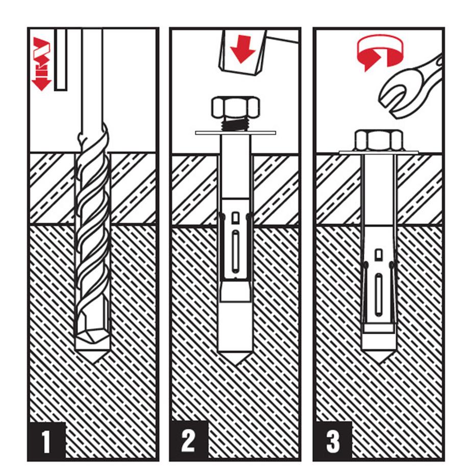 болт устанавливается в заранее просверленное отверстие. Устанавливается с помощью молотка, затяжка осуществляется вручную с помощью накидного гаечного ключа. За счет специальной формы распорной втулки допускается применение в кирпичной кладке из полнотелого кирпича. Специально разработанные круглые разрезы на втулке позволяют равномерно распределить усилие распора в теле материала основания, что способствует получению большей несущей способности.