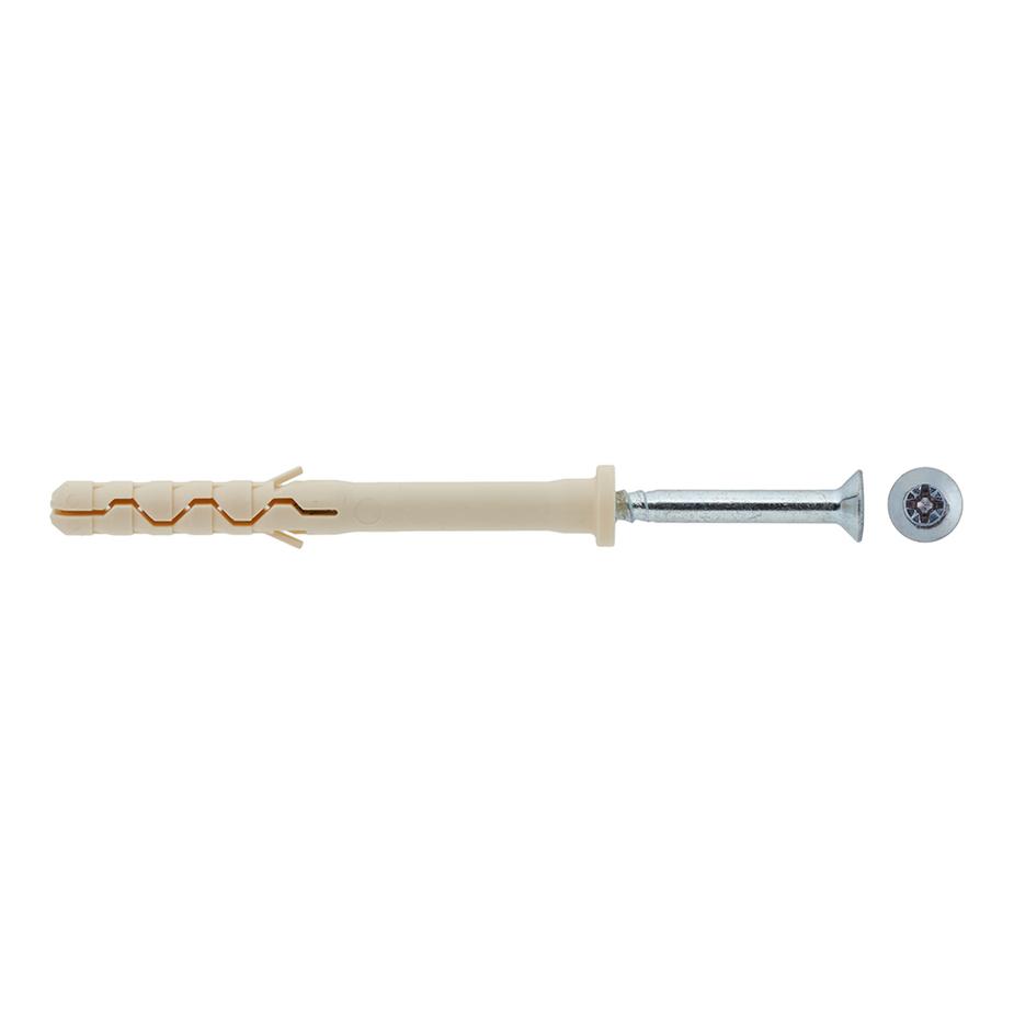 Предназначен для легких креплений (небольшие нагрузки) в твердые материалы: полнотелый кирпич, бетон, природный камень. Нейлон обеспечивает надежное сцепление с материалом основания. Резьбовой оцинкованный гвоздь повышенной прочности заранее установлен в дюбель.