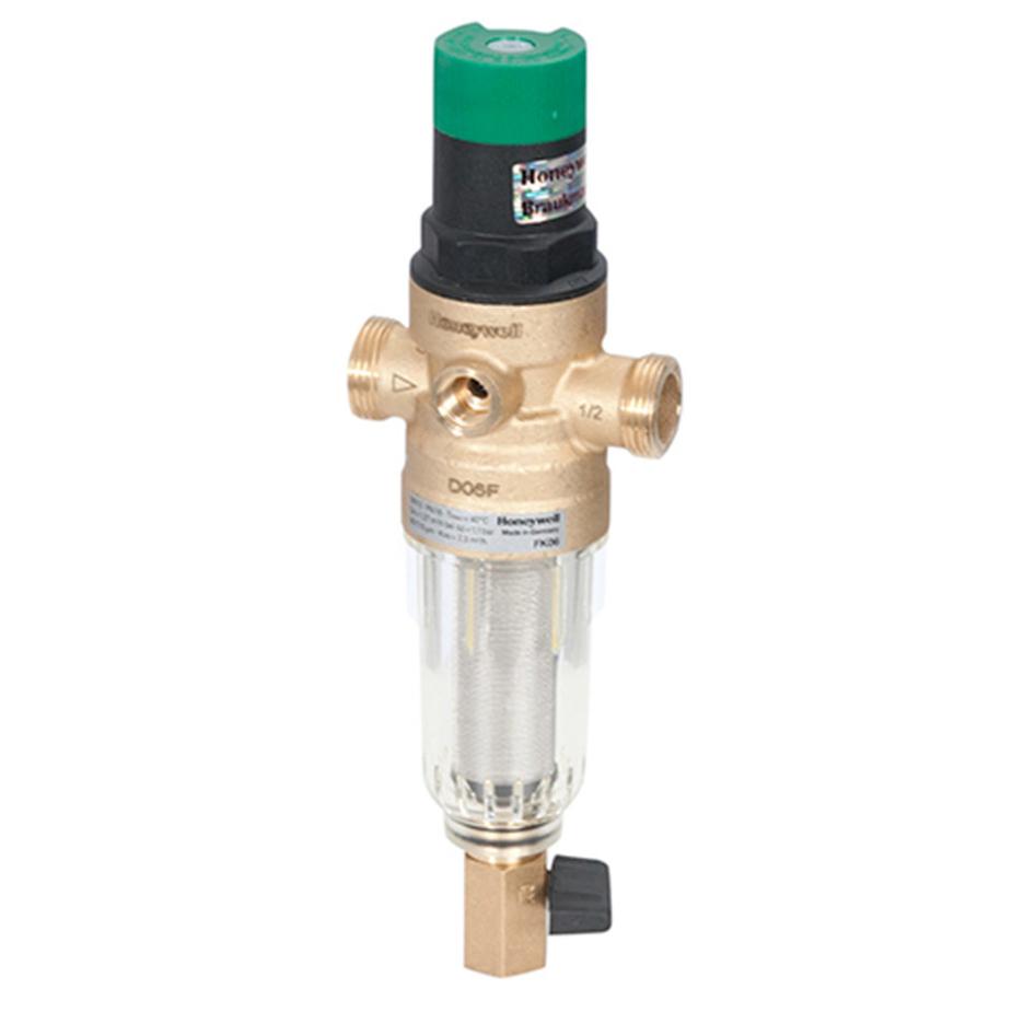Фильтр Braukmann для воды холодной со встроенным редуктором давления для предварительной очистки холодной воды от механических примесей – частиц ржавчины, волокон пеньки, песчинок, защиты сантехники, бытовой техники подключенной к водопроводу. Фильтр редуктор для воды холодной представляет собой комбинацию промывного фильтра с клапаном понижения давления. Встроенный в корпус клапан понижения давления позволяет защитить магистрали и устройства водопотребления от нежелательных колебаний давления, а также уменьшить расход воды. Выходное давление регулируется в пределах от 1,5 бар (0,15 МПа) до 6,0 бар (0,6 МПа). На корпусе с двух сторон предусмотрены посадочные места для подключения манометра, позволяющего визуально отслеживать давление воды на выходе. Регулирующая пружина клапана с водой не контактирует. Седло клапана сбалансировано. Фильтр с редуктором давления для воды холодной (Хоневелл) со встроенным клапаном оказывает давление мембраны уравновешено давлением регулирующей пружины. Это означает, что выходное давление возрастает до тех пор, пока усилия мембраны и действующей в противовес регулирующей пружины не будут уравновешены. Величина давления на входе не влияет на открывание или закрывание клапана, вследствие чего изменение входного давления не оказывает влияния на давление выходное. В обычном режиме вода проходит через фильтрующий элемент по направлению к выпускному отверстию корпуса. Для осуществления промывки необходимо открыть шаровой клапан, выпускающий скопившиеся на дне чаши фильтра примеси подача воды при этом не прерывается. Фильтр имеет большой запас прочности по максимальному рабочему давлению. Сменная фильтрующая сетка изготовлена из нержавеющей стали и, при необходимости, заменяется на другую без демонтажа фильтра. Используется в водоснабжении зданий всех типов, может использоваться в промышленных и коммерческих целях. Монтажное положение фильтра – устанавливается на горизонтальном трубопроводе чашей вниз.