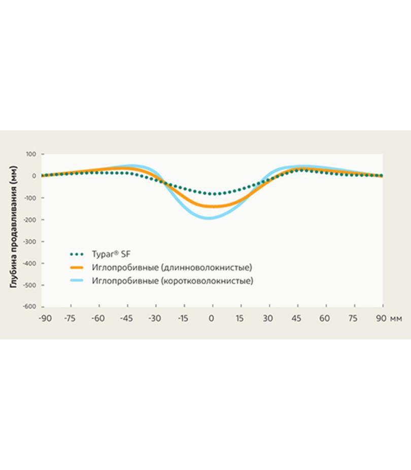 При воздействии нагрузки Typar® демонстрирует меньшее удлинение, чем иглопробивные материалы. Это означает меньшую деформацию и меньшую колею, например, для грунтовых дорог или дорог на слабых основаниях.