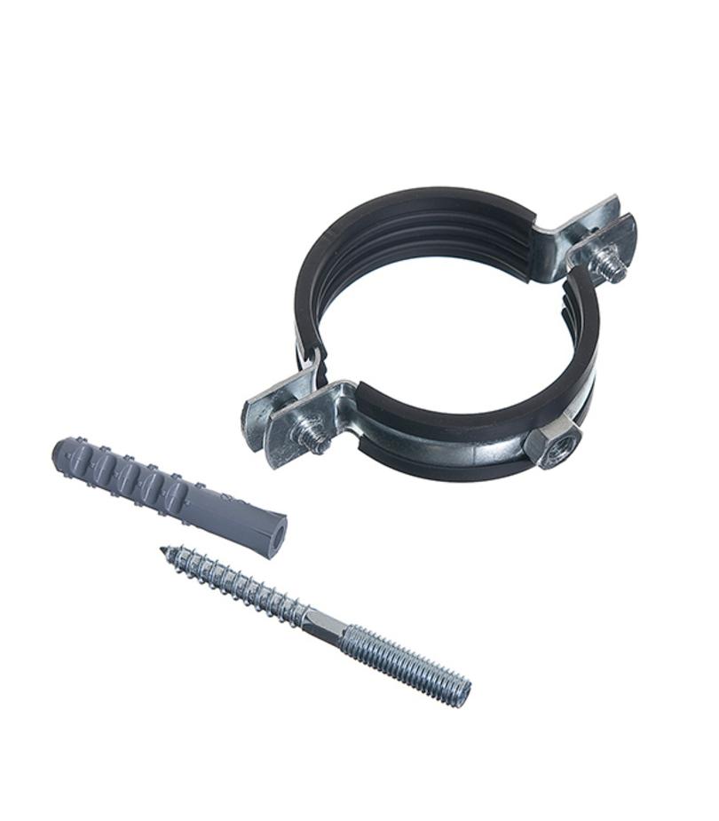 Предназначен для крепления канализационных или иных труб диаметром 60-64 мм к стене или к полу. Состав хомут, шпилька М8 – оцинкованная сталь, уплотнитель – резина, дюбель 10х50 мм – полипропилен.