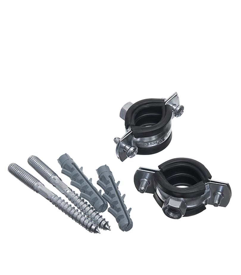 Предназначен для крепления металлопластиковых или иных труб диаметром 16-20 мм к стене или к полу. Состав хомут, шпилька М8 – оцинкованная сталь, уплотнитель – резина, дюбель 10х50 мм – полипропилен.