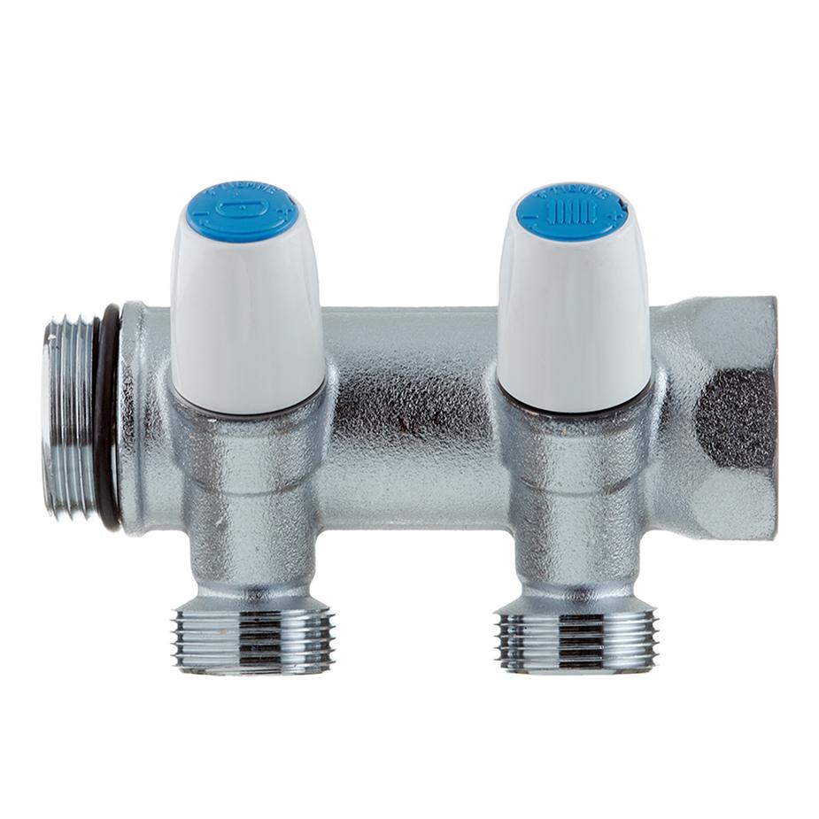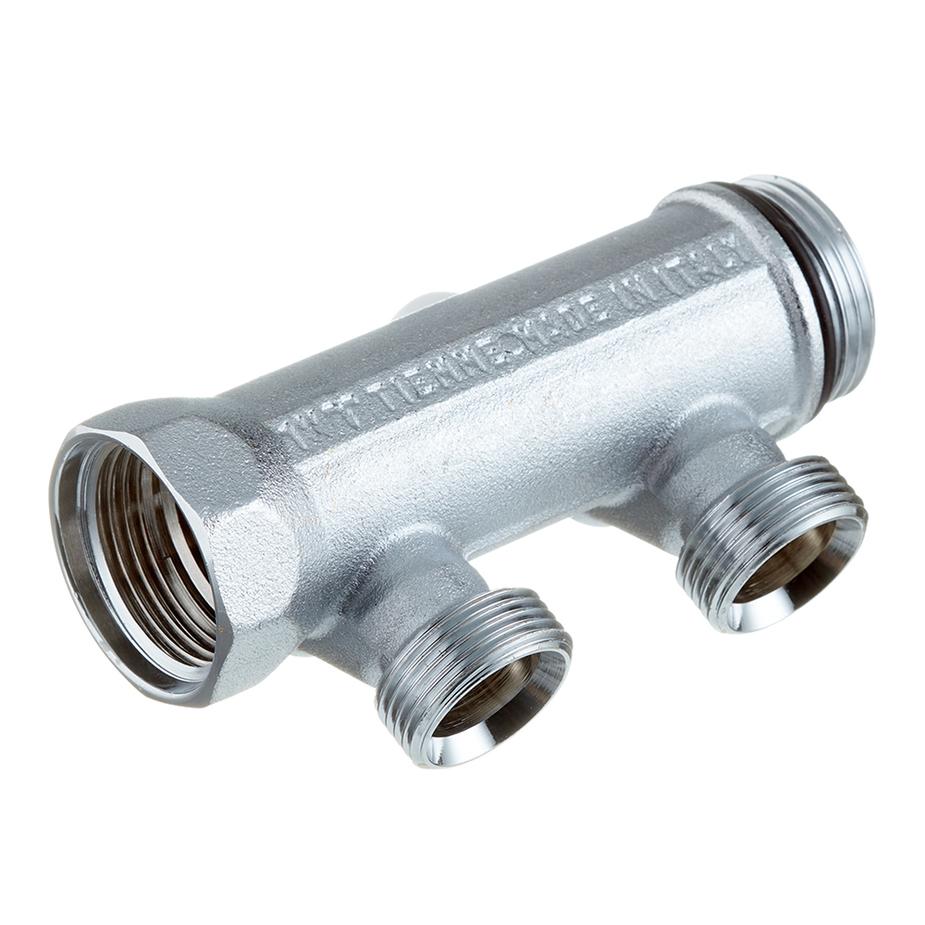 Предназначен для равномерного распределения и поступления воды от главного трубопровода к сантехнике и другим потребителям без потери напора воды. Позволяет изолировать часть системы в случае неисправностей и проводить ремонт, не производя при этом общего отключения водоснабжения. Имеет с одного входа внутреннюю резьбу 1″ (25 мм) с другого входа наружную резьбу 1″ (25 мм), что позволяет соединять коллекторы между собой, увеличивая количество отводимых линий. Межосевое расстояние между отводами 50 мм.