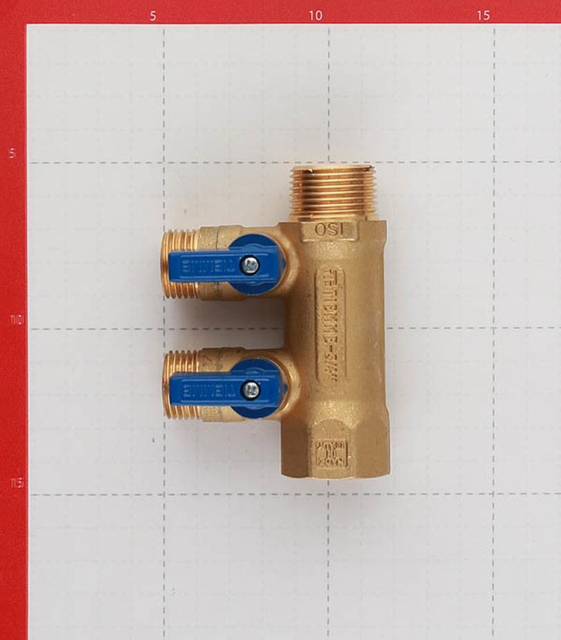 Предназначен для равномерного распределения и поступления воды от главного трубопровода по металлопластиковым трубам к сантехнике и другим потребителям без потери напора воды. Позволяет изолировать часть системы в случае неисправностей и проводить ремонт, не производя при этом общего отключения водоснабжения. Используется для разделения потока воды из одной трубы на две линии. Имеет с одного входа внутреннюю резьбу 3/4″ (20 мм) с другого входа наружную резьбу 3/4″ (20 мм), что позволяет соединять коллекторы между собой, увеличивая количество отводимых линий. Ручки синего цвета. Межосевое расстояние между отводами 36 мм.