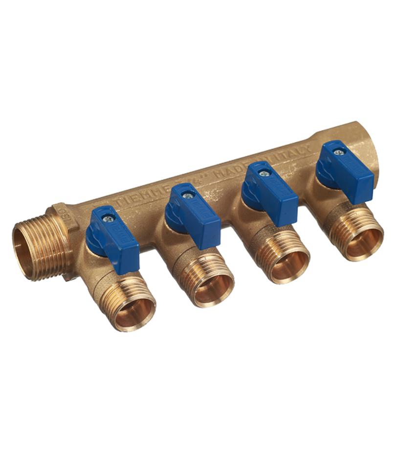 Коллектор Tiemme 3/4 ВР(г) х 4 выхода 1/2 НР(ш) ЕК х 3/4 НР(ш) с шаровыми кранами