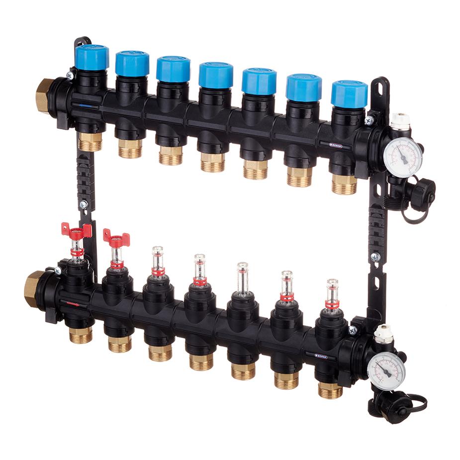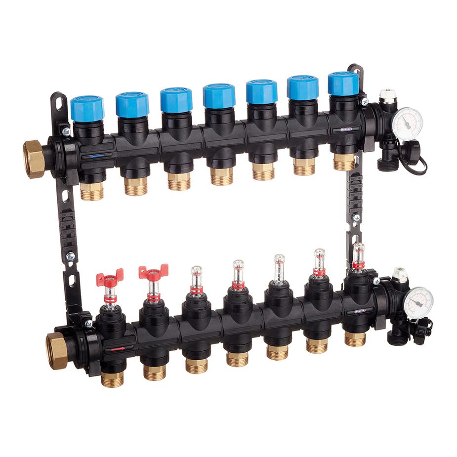 Коллекторная группа Henco (UFH-0605MDK07-03L) 1 ВР(г) х 7 выходов 3/4 НР(ш) ЕК х 1 ВР(г) с расходомерами композитная