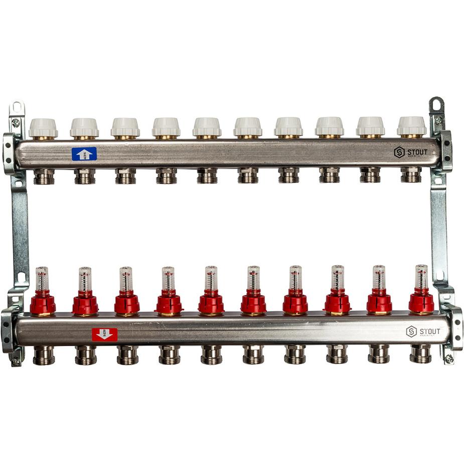 Коллекторная группа Stout (SMS 0917 000010) 1 ВР(г) х 10 выходов 3/4 НР(ш) ЕК х 1 ВР(г) с расходомерами нержавеющая сталь
