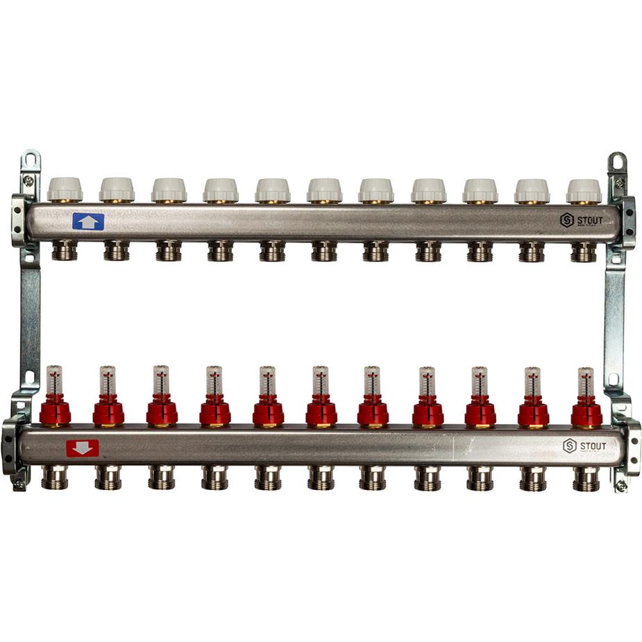 Коллекторная группа Stout (SMS 0917 000011) 1 ВР(г) х 11 выходов 3/4 НР(ш) ЕК х 1 ВР(г) с расходомерами нержавеющая сталь