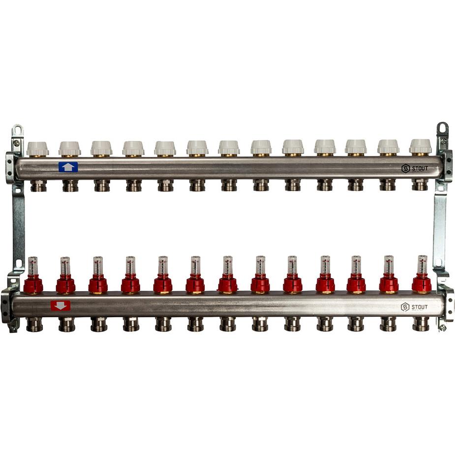 Коллекторная группа Stout (SMS 0917 000013) 1 ВР(г) х 13 выходов 3/4 НР(ш) ЕК х 1 ВР(г) с расходомерами нержавеющая сталь