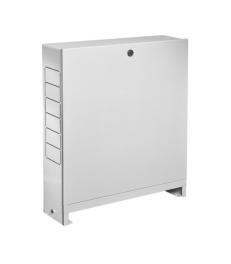 Предназначен для монтажа в нем коллекторов систем отопления и водоснабжения. В боковых стенках корпуса шкафа выполнена перфорация, сегменты которой удаляются в любом удобном месте для подсоединения трубопроводов. Внутри шкафа установлены универсальные профильные крепления, позволяющие располагать оборудование по всей высоте и ширине шкафа. Шкаф имеет регулировки по высоте до 40 мм за счет выдвижных ножек. Крепление шкафа к полу осуществляется с помощью отверстий в выдвижных ножках, а к стене – с помощью отверстий в задней стенке. Для защиты от несанкционированного доступа шкаф оснащен внутренним замком «под монетку». Расшифровка маркировки ШРН – шкаф распределительный накладной, 3 – подходит для установки коллекторной группы на 8 отводов. Состав оцинкованная сталь, порошковое покрытие.
