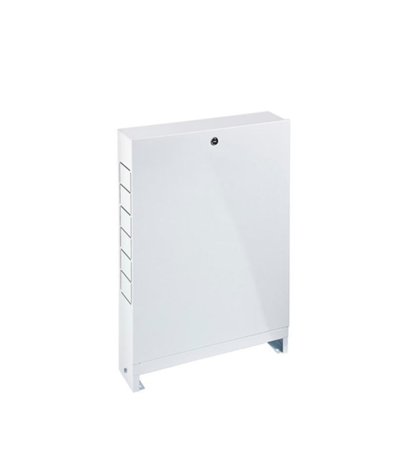 Предназначен для монтажа в нем коллекторов систем отопления и водоснабжения. В боковых стенках корпуса шкафа выполнена перфорация, сегменты которой удаляются в любом удобном месте для подсоединения трубопроводов. Внутри шкафа установлены универсальные профильные крепления, позволяющие располагать оборудование по всей высоте и ширине шкафа. Шкаф имеет регулировки до 40 мм за счет выдвижных ножек, позволяющих увеличивать высоту шкафа от 651 мм до 691 мм. Крепление шкафа к полу осуществляется с помощью отверстий в выдвижных ножках, а к стене – с помощью отверстий в задней стенке. Для защиты от несанкционированного доступа шкаф оснащен внутренним замком «под монетку».