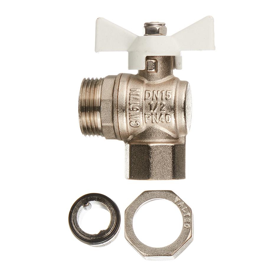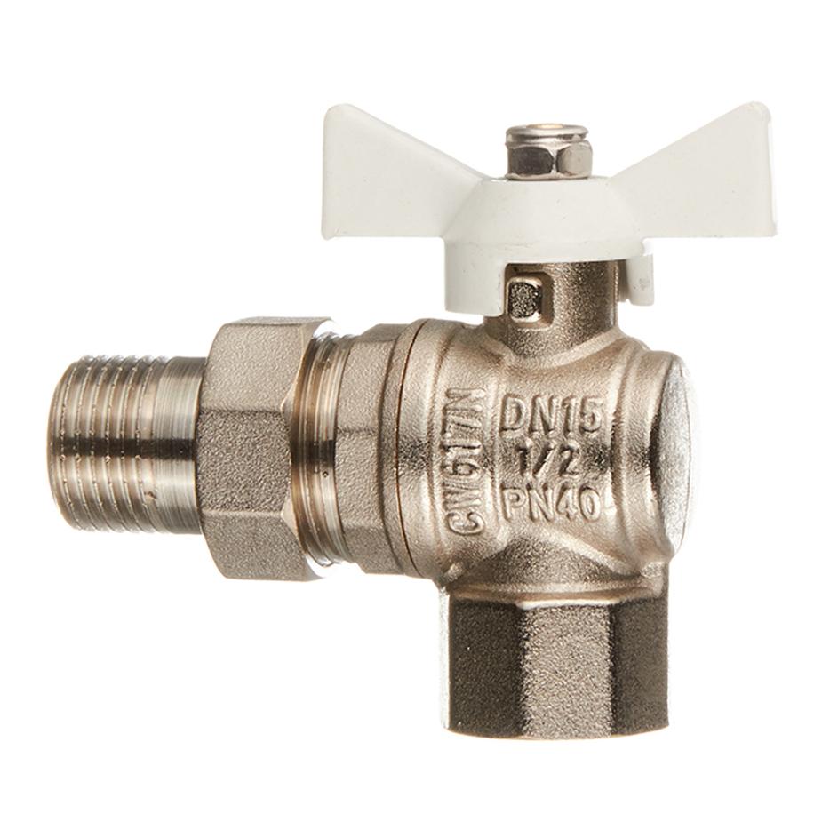 Предназначен для полного открытия или закрытия потока воды. Полнопроходной, ремонтопригодный, с увеличенным ресурсом. Соединен накидной гайкой с резьбовым полусгоном. Корпуса деталей – латунные, никелированные. Кран оснащен ручкой типа «бабочка» с утолщенной стенкой из алюминиевого сплава и эпоксидным покрытием белого цвета. Резьба присоединений – внутренняя/наружная. Гарантия 10 лет. Средний полный срок службы: 30 лет. Максимальная рабочая температура: +120?С Номинальное давление: 40 Бар. Расшифровка маркировки 1/2″ – диаметр условного прохода (16 мм), в/н – 1 проход с внутренней резьбой, 1 – с наружной, бабочка – тип ручки. Производитель Италия/Китай.