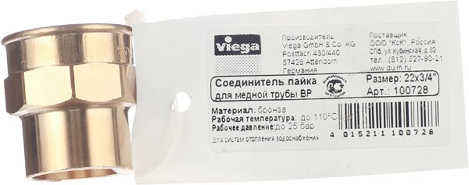 Муфта Viega под внутреннюю пайку 22 мм х 3/4 ВР(г) медная