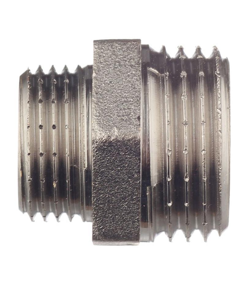 Предназначен для соединения элементов трубопровода разного диаметра. Выполнен из латуни CW617N (евростандарт EN12165) горячим штампованием с последующим никелированием. Резьба обоих патрубков – наружная (тип – цилиндрическая трубная, ГОСТ 6357, ISO 228, EN10226). Насечки на резьбе способствуют удержанию герметизирующего материала (например, сантехнического льна). Наличие шестигранного (под гаечный ключ) участка корпуса облегчает монтаж соединения. Имеет один выход с наружной резьбой 1/2″ (16 мм) и другой с наружной резьбой 3/8″ (10 мм). Состав никелированная латунь. Расшифровка маркировки ш – штуцер (наружная резьба). Производитель Италия / Китай.
