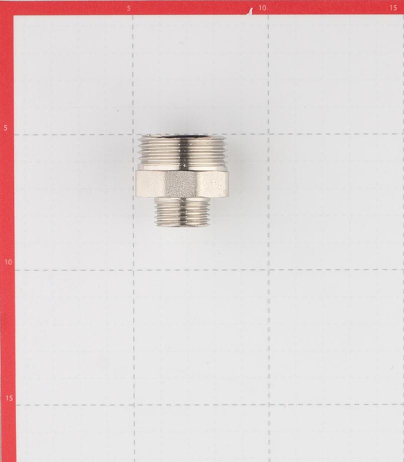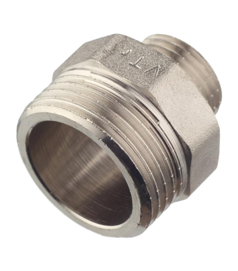 Предназначен для соединения элементов трубопровода разного диаметра. Выполнен из латуни CW617N (евростандарт EN12165) горячим штампованием с последующим никелированием. Резьба обоих патрубков – наружная (тип – цилиндрическая трубная, ГОСТ 6357, ISO 228, EN10226). Насечки на резьбе способствуют удержанию герметизирующего материала (например, сантехнического льна). Наличие шестигранного (под гаечный ключ) участка корпуса облегчает монтаж соединения. Имеет один выход с наружной резьбой 1/2″ (16 мм) и другой с наружной резьбой 1″ (25 мм). Состав никелированная латунь. Расшифровка маркировки ш – штуцер (наружная резьба). Производитель Италия / Китай.