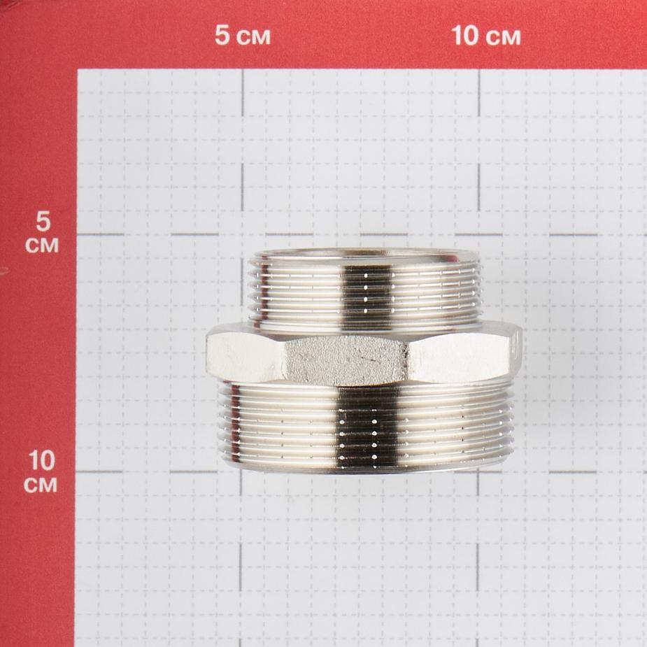 Предназначен для соединения элементов трубопровода разного диаметра. Материал – никелированная латунь. Резьба обоих патрубков – наружная (тип – цилиндрическая трубная, ГОСТ 6357, ISO 228, EN10226). Насечки на резьбе способствуют удержанию герметизирующего материала (например, сантехнического льна). Наличие шестигранного (под гаечный ключ) участка корпуса облегчает монтаж соединения. Размер 2″х 1 1/2″. Производитель Италия/Китай.