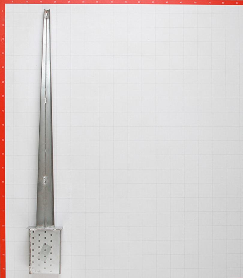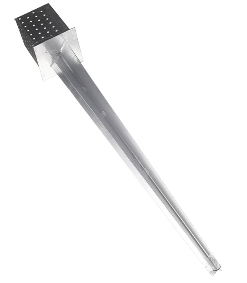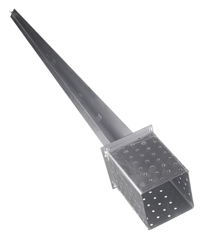 Предназначена для установки опор и балок в легких не несущих конструкциях. Имеет отверстия диаметром 5 мм под саморезы или гвозди. Изготовлена из оцинкованной стали. Максимально-рекомендованное сечение бруса 100х100 мм. Расшифровка маркировки ребро забивной части – 4, забивная часть – 750 мм , размер стакана – 100х100х150 мм, толщина материала – 2 мм.