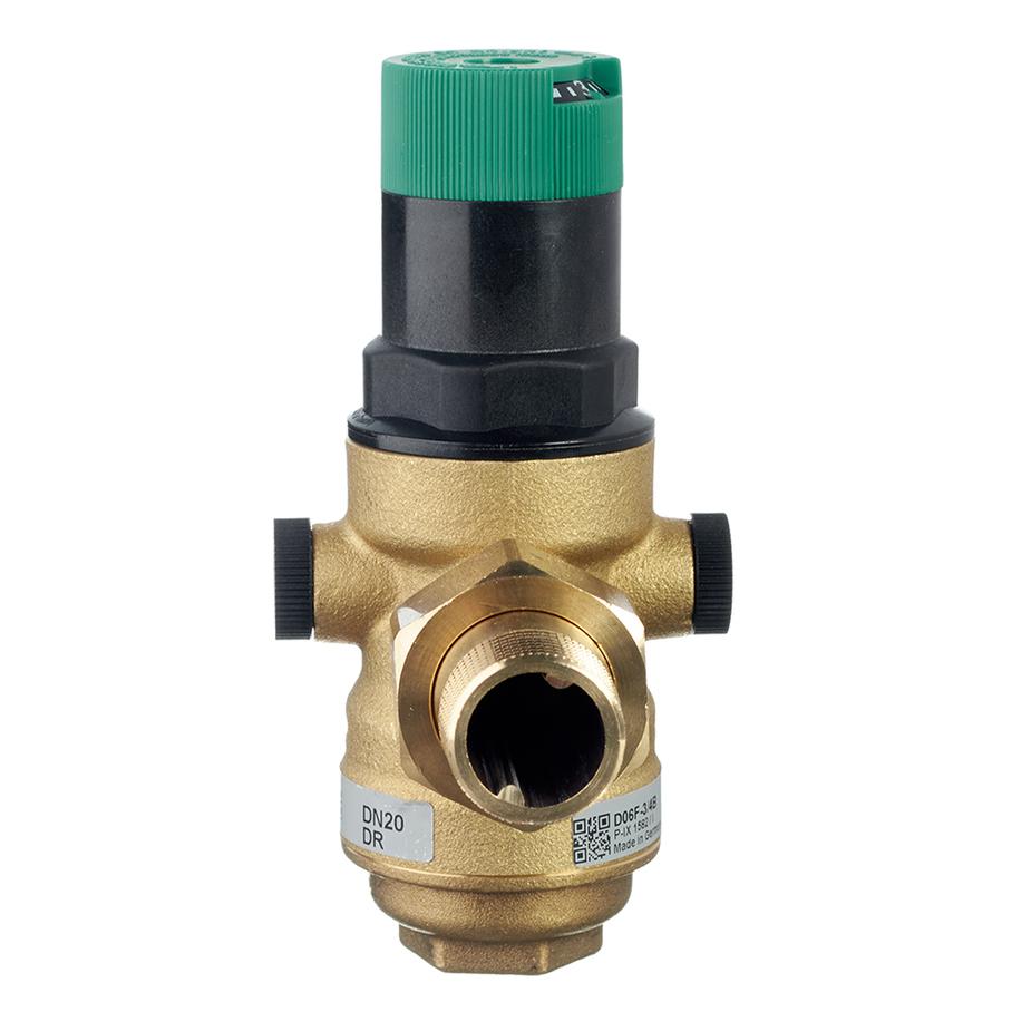 Клапан понижения давления Braukmann D06F-3/4″B со сбалансированным седлом, для горячей и холодной воды. Клапан с понижением давления с пружиной действует по принципу уравнивания усилий, когда усилие диафрагмы направлено против усилия регулировочной пружины. Если выпускное давление, а вместе с ним и нажим диафрагмы, уменьшается в результате забора воды, то большее давление пружины вызывает открывание клапана. Выпускное давление повышается до тех пор, пока усилия диафрагмы и пружины вновь не уравняются. Впускное давление не влияет на момент открывания или закрывания клапана. Поэтому флуктуации впускного давления не сказываются на выходном давлении, обеспечивая таким образом уравнивание впускного давления. Стандартная конфигурация с установочной шкалой. Предохраняет бытовые установки водоснабжения от избыточного давления в системе. Уменьшает расход воды. Поддерживает постоянный уровень установленного давления. Установка давления производиться поворотом регулировочной ручки. Регулировочная пружина не находиться в контакте с водой. Поставляется с установленным фильтрующим элементом 0,16 мм. Для подключения манометра предусмотрены 2 закрывающихся слота G 1/4.