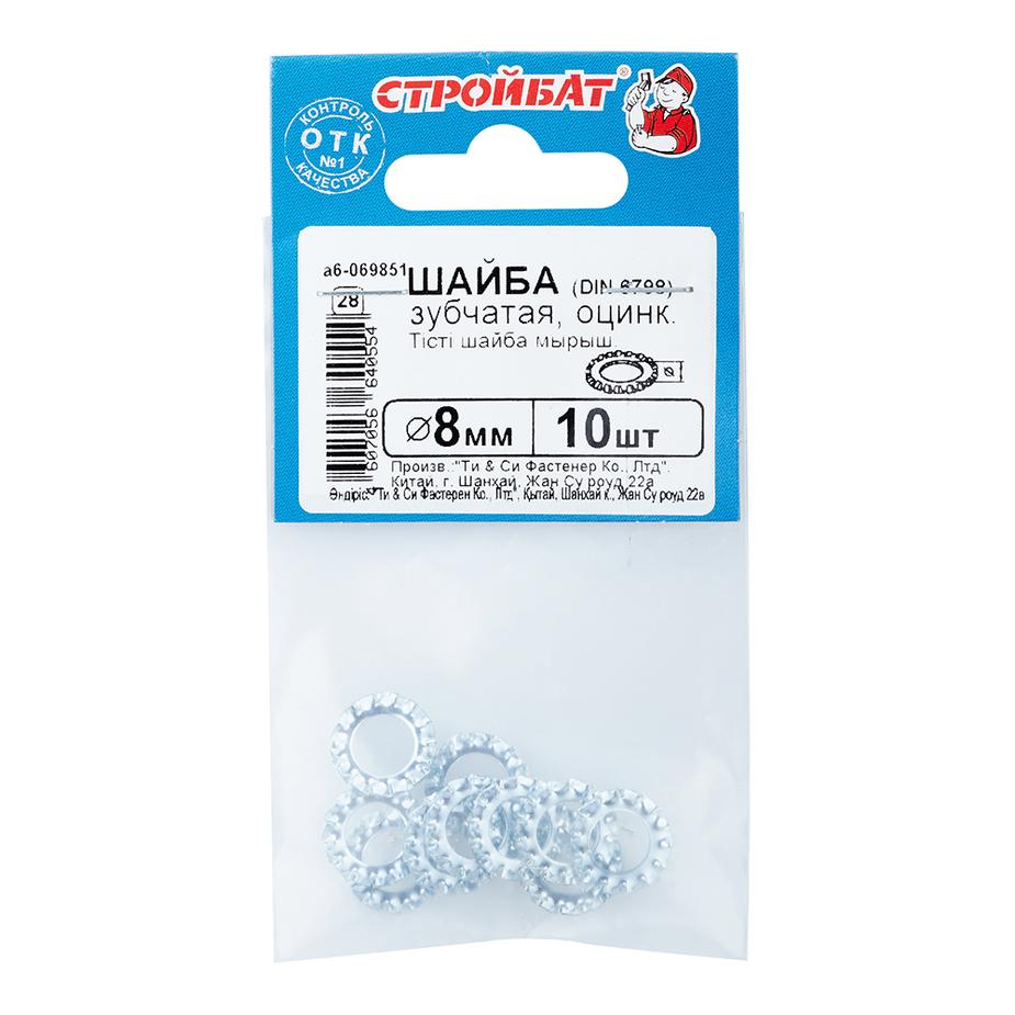 Предназначены для увеличения опорной площади и снижения нагрузок на поверхность детали, а также для того, чтобы предотвратить процесс самовывинчивания крепежных элементов. Наружные зубчики обеспечивают надежное схватывание с поверхностью соединяемого изделия. Форма зубчиков такова, что при завертывании гайки, врезаясь острыми гранями в гайку и в опорную поверхность корпуса, препятствуют ее откручиванию. Цинковое покрытие защищает от коррозии. Расшифровка маркировки 8 – диаметр резьбы крепежного изделия, с которым может использоваться шайба.