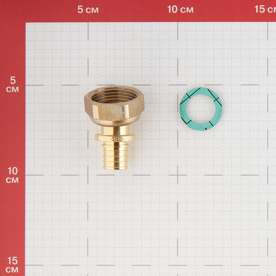 Предназначен для соединения труб Stout диаметром 16 мм с различной арматурой, имеющей выходы с плоским торцом и с наружной резьбой 3/4″. Монтируется с помощью набора специальных инструментов. Состав соединитель – латунь, прокладка – паронит. Расшифровка маркировки г – гайка (внутренняя резьба). Страна-производитель Италия.