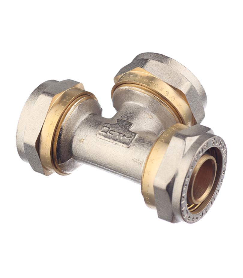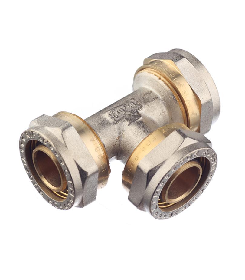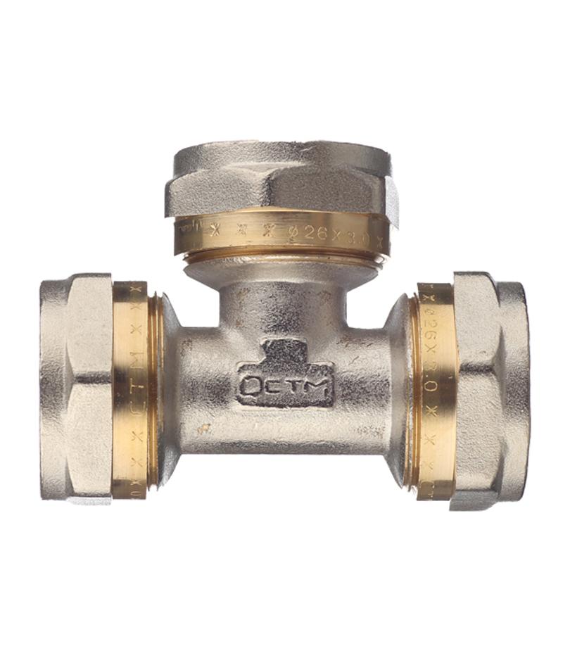Предназначен для разветвления потока воды на два направления, а именно для соединения методом обжима трех металлопластиковых труб диаметром 26 мм. Расшифровка маркировки ц – цанга (обжим). Состав латунь. Производитель Китай.