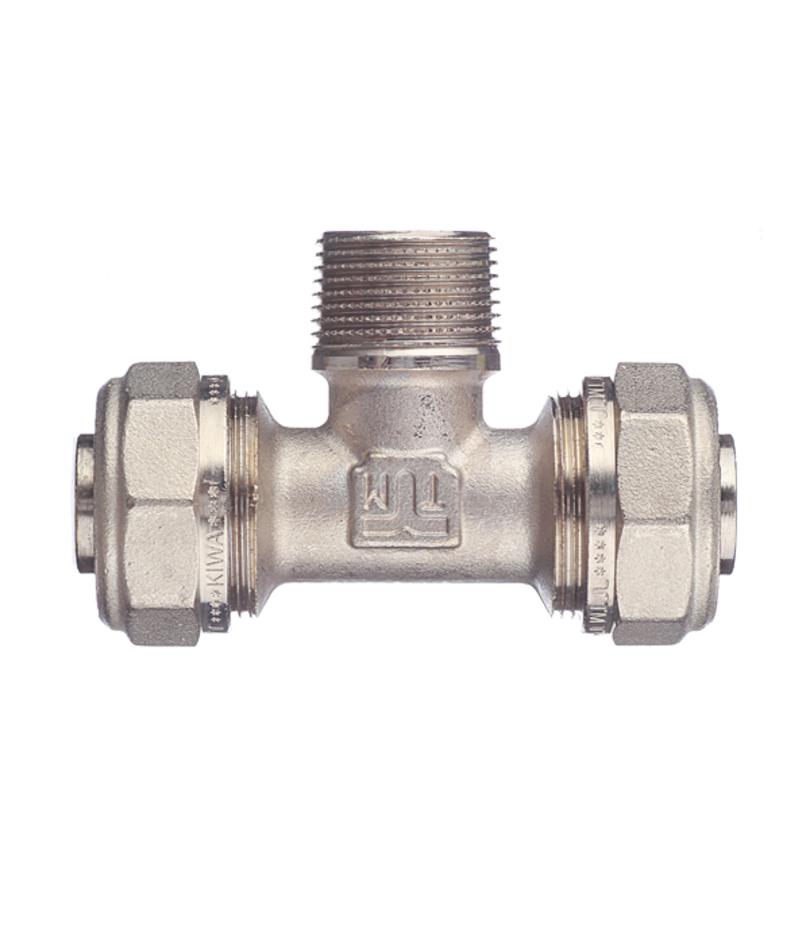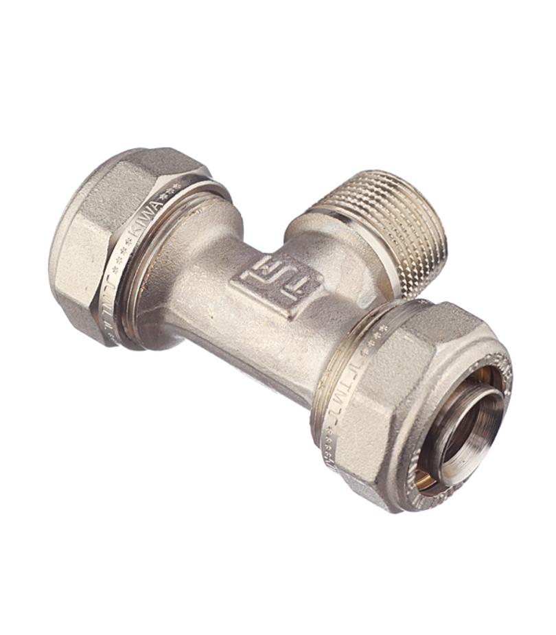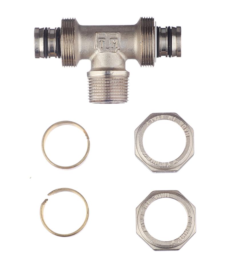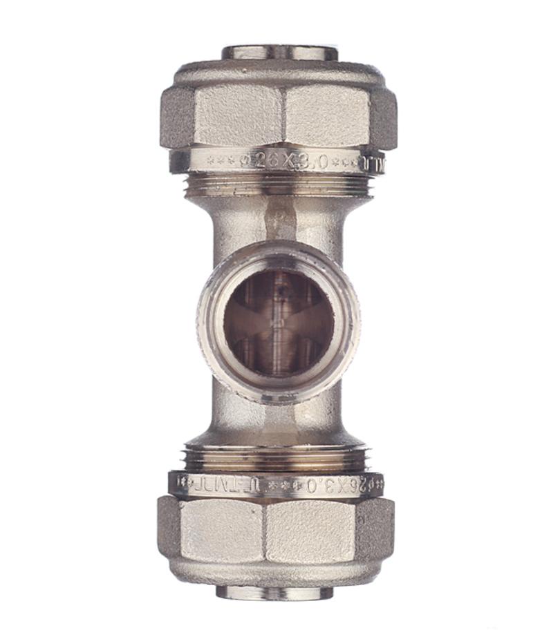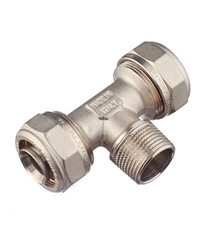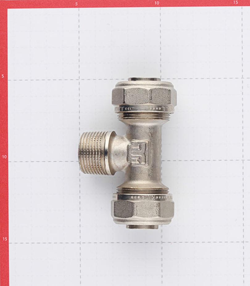 Предназначен для разветвления потока воды на два направления. Имеет два выхода для соединения металлопластиковых труб диаметром 26 мм методом обжима и один выход с наружной резьбой 3/4″ (20 мм). Состав латунь. Расшифровка маркировки ц – цанга (обжим), ш – штуцер (наружная резьба). Производитель Tiemme (Италия).