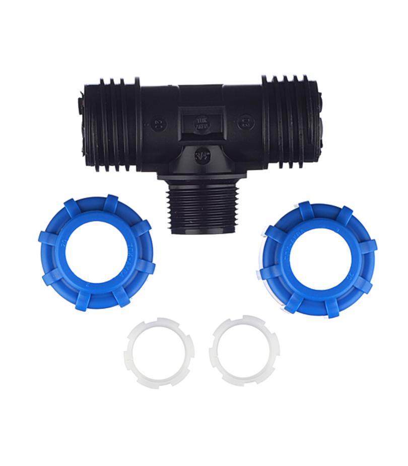 Предназначен для разветвления потока воды на два направления. Имеет два выхода для соединения труб ПНД диаметром 20 мм и один выход с наружной резьбой 3/4″ (20 мм).