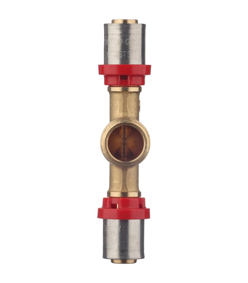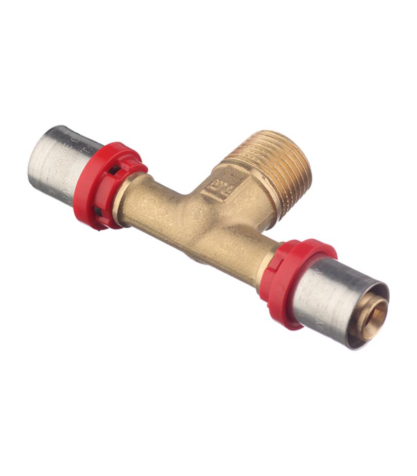 Предназначен для разветвления потока воды на два направления. Имеет два выхода для соединения металлопластиковых труб диаметром 16 мм методом опрессовки и один выход с наружной резьбой 1/2″ (16 мм). Состав латунь, пресс-гильза из нержавеющей стали. Расшифровка маркировки ш – штуцер (наружная резьба). Производитель Италия.