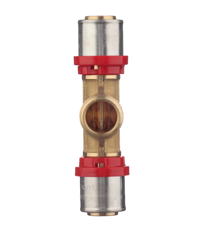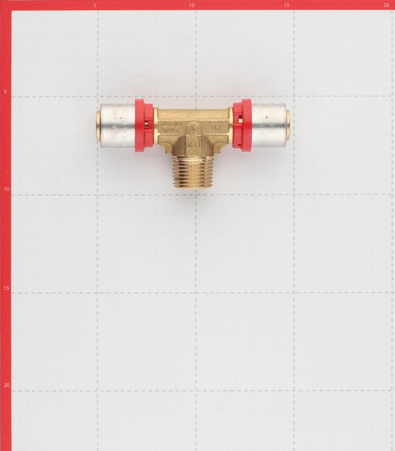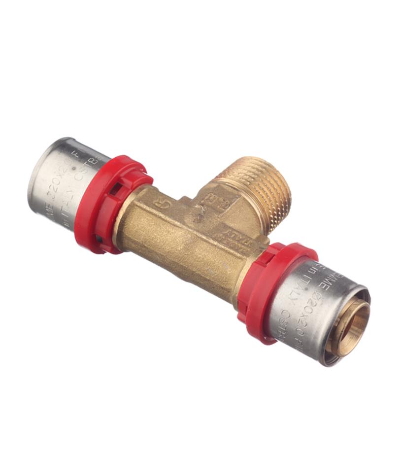 Предназначен для разветвления потока воды на два направления. Имеет два выхода для соединения металлопластиковых труб диаметром 20 мм методом опрессовки и один выход с наружной резьбой 1/2″ (16 мм). Состав латунь, пресс-гильза из нержавеющей стали. Расшифровка маркировки ш – штуцер (наружная резьба). Производитель Италия.