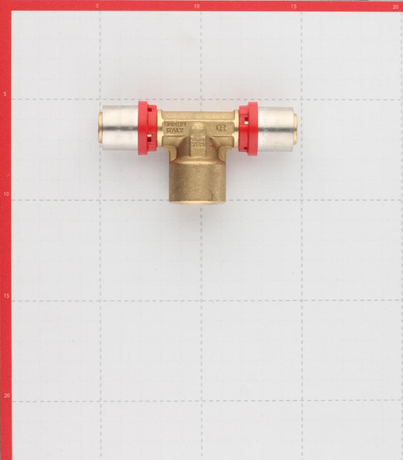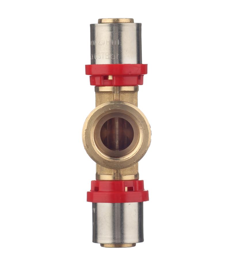 Предназначен для разветвления потока воды на два направления. Имеет два выхода для соединения металлопластиковых труб диаметром 20 мм методом опрессовки и один выход с внутренней резьбой 1/2″ (16 мм). Состав латунь, пресс-гильза из нержавеющей стали. Расшифровка маркировки г – гайка (внутренняя резьба). Производитель Италия.