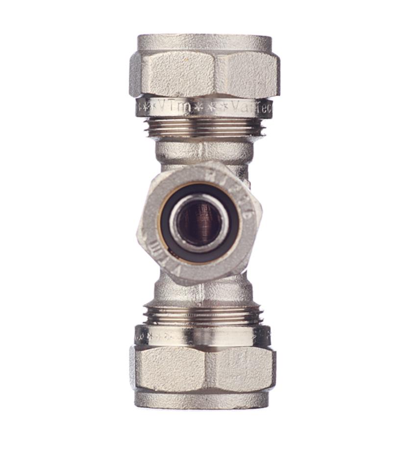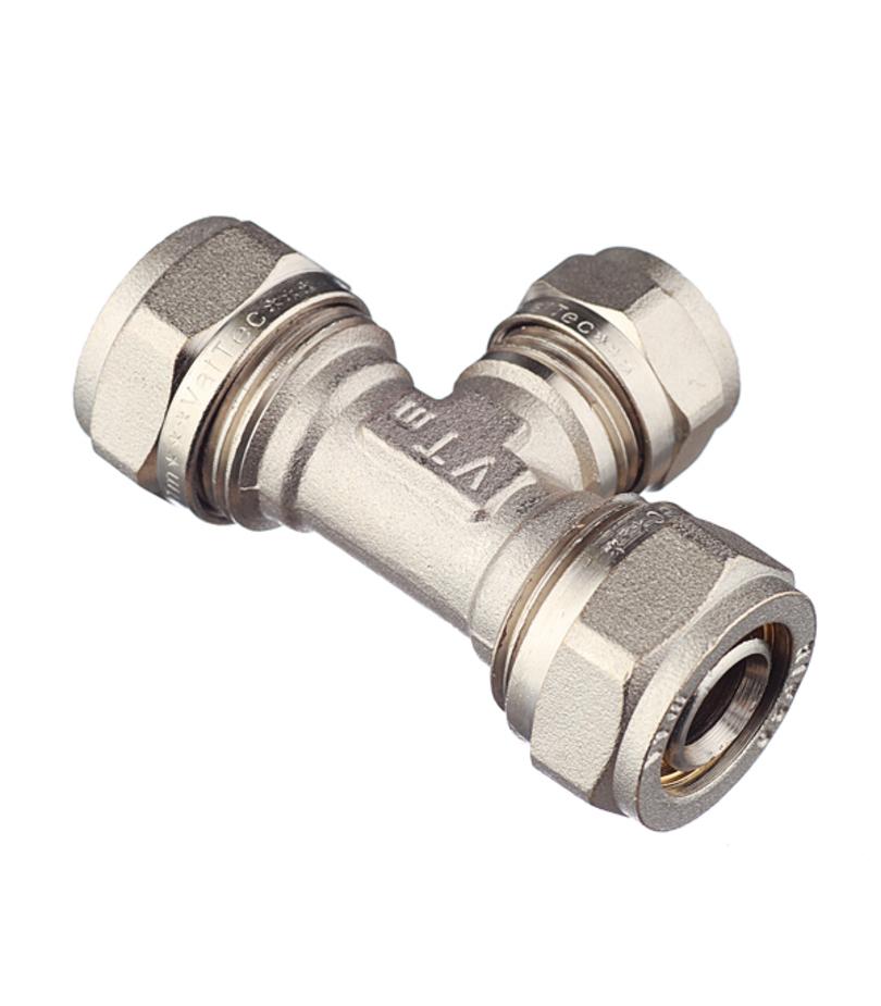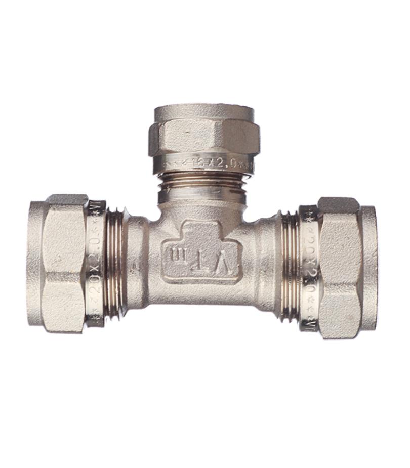 Предназначен для разветвления потока на два направления посредством присоединения к фитингу трех металлопластиковых (металлополимерных) труб. Диаметры труб: 20 мм., 16 мм., 20 мм. Может использоваться в системах питьевого и хозяйственного водопровода, горячего водоснабжения, отопления, а также на технологических трубопроводах, транспортирующих жидкости, не агрессивные к материалам фитинга. Состав никелированная латунь. Расшифровка маркировки ц – цанга (обжим). Производитель Италия / Китай.