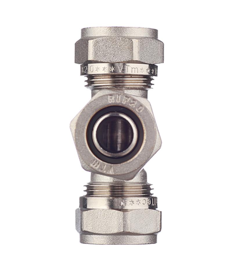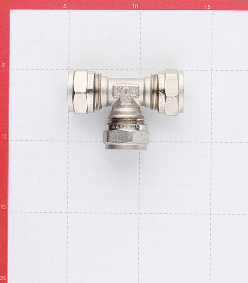 Предназначен для разветвления потока на два направления посредством присоединения к фитингу трех металлопластиковых (металлополимерных) труб диаметром 20 мм. Может использоваться в системах питьевого и хозяйственного водопровода, горячего водоснабжения, отопления, а также на технологических трубопроводах, транспортирующих жидкости, не агрессивные к материалам фитинга. Состав никелированная латунь. Расшифровка маркировки ц – цанга (обжим). Производитель Италия / Китай.