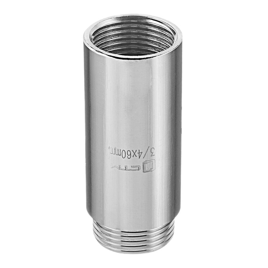Предназначен для удлинения резьбового соединения на 60 мм. С одной стороны имеет внутреннюю резьбу 3/4″ (20 мм), с другой стороны наружную 3/4″ (20 мм). Состав хромированная латунь никелированная. Расшифровка маркировки НР – наружная резьба. Производитель Китай.