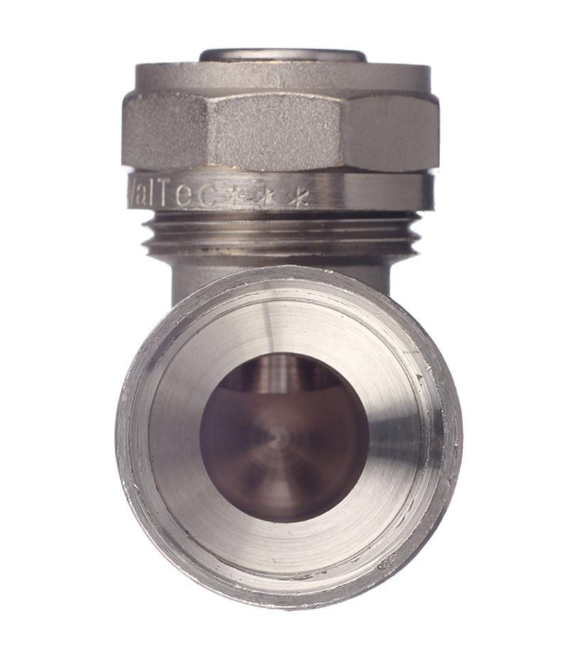 Предназначен для изменения направления потока под углом 90°. С одной стороны к фитингу присоединяется методом обжима металлополимерная (металлопластиковая) труба, с другой стороны – переход на внутреннюю резьбу. Диаметр трубы 26 мм. Диаметр резьбы 1″. Резьба фитинга – внутренняя трубная по ГОСТу 6357. Фитинг может использоваться в системах питьевого и хозяйственного водопровода, горячего водоснабжения, отопления, а также на технологических трубопроводах, транспортирующих жидкости, не агрессивные к материалам фитинга. Состав никелированная латунь. Расшифровка маркировки г – гайка (внутренняя резьба), ц – цанга (обжим). Производитель Италия / Китай.