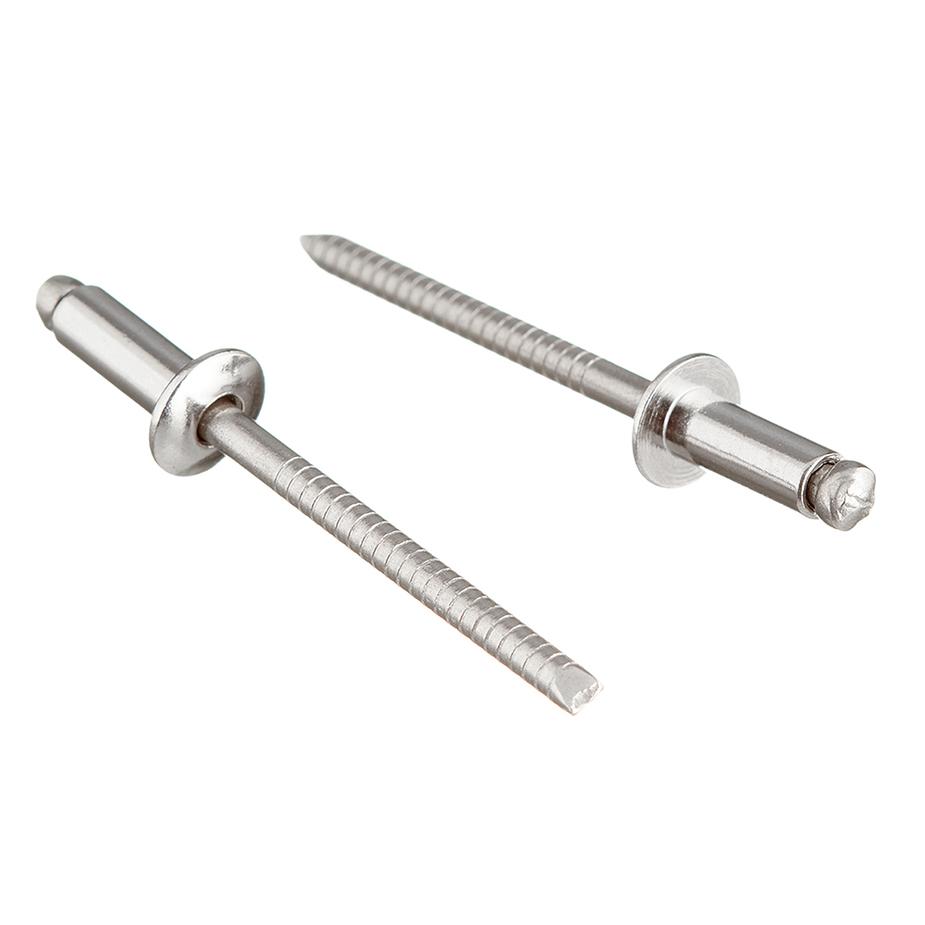Предназначены для получения надежного неразъемного соединения различных материалов толщиной от 4 до 6 мм. Вытяжные заклепки удобны тем, что для их установки необходим доступ к скрепляемым поверхностям лишь с одной стороны. Можно применять для наружных и внутренних работ.